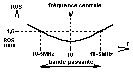 Dans ce cet exemple, la bande passante de l'antenne donnant un ROS inférieur à 1,5 est de +/- 5 MHz, soit 10 MHz. Si f0 = 435 MHz, l'antenne peut fonctionner raisonnablement de 430 à 440 MHz. |