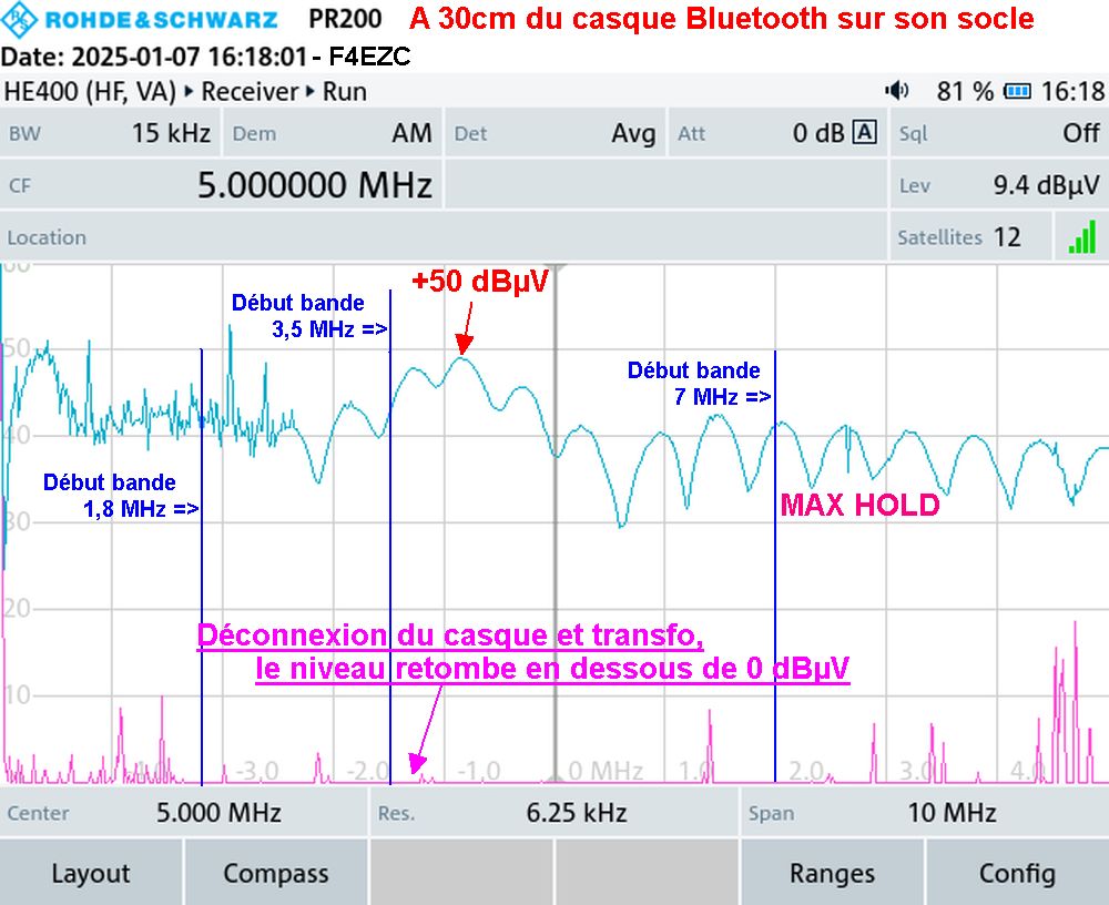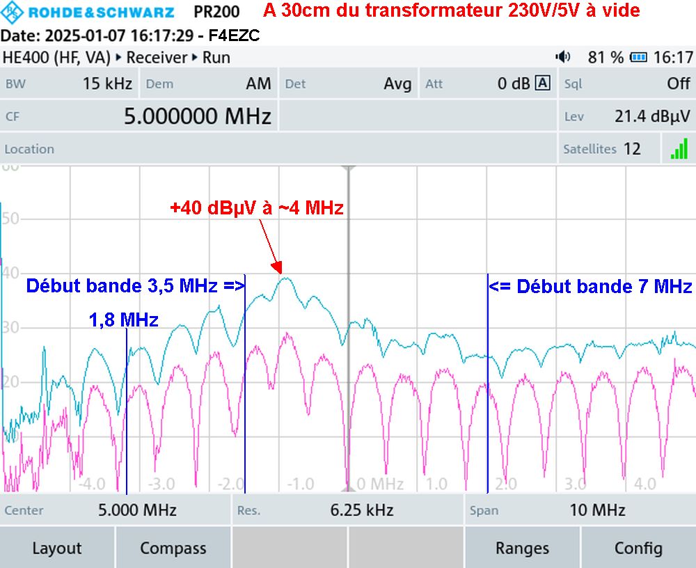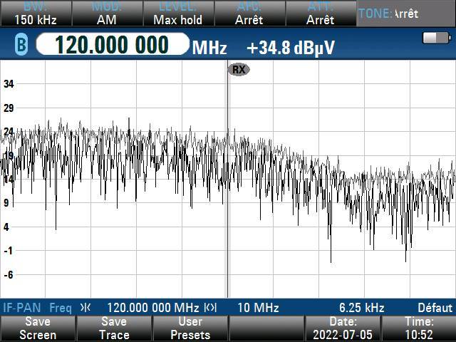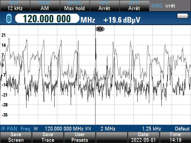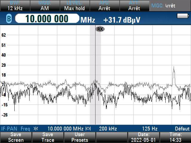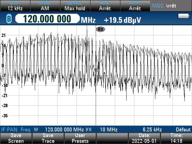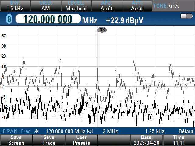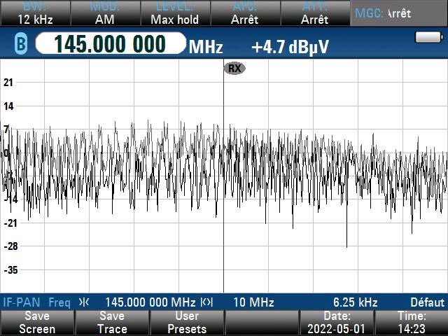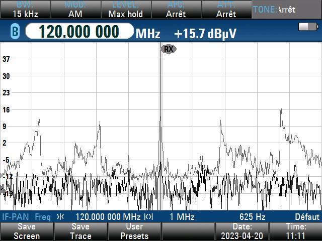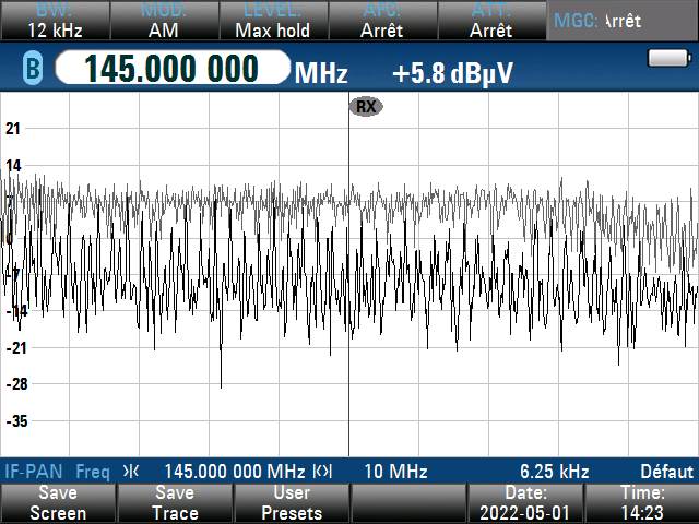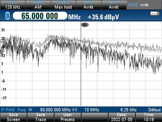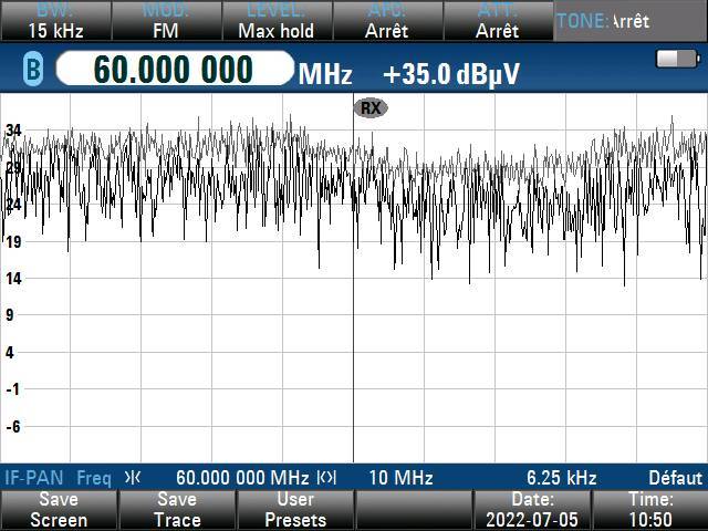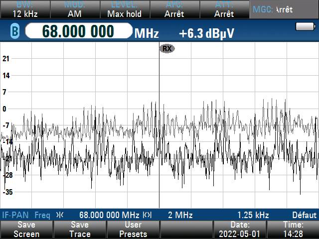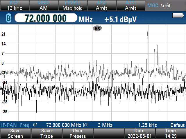 Mesures PR100 : (32,2dBµV / -75dBm / 40µV) ![]() (31,7dBµV / -75dBm / 38µV)