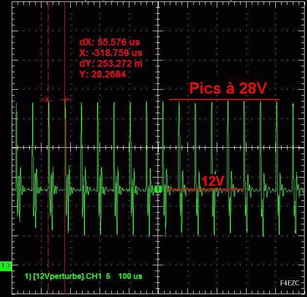 | Onduleur en défaut avec des pics destructeurs à plus de 28V crêtes :