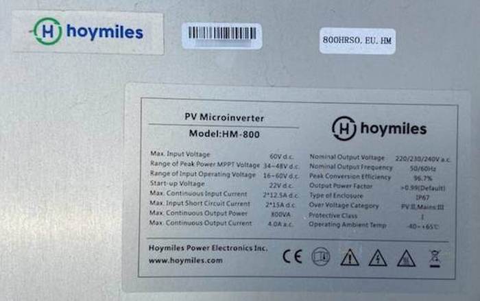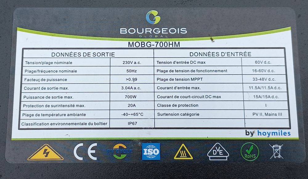 | 2 panneaux solaires. Micro-onduleurs HOYMILES HM-800S (ou Bourgeois MOBG-HMS800...) |